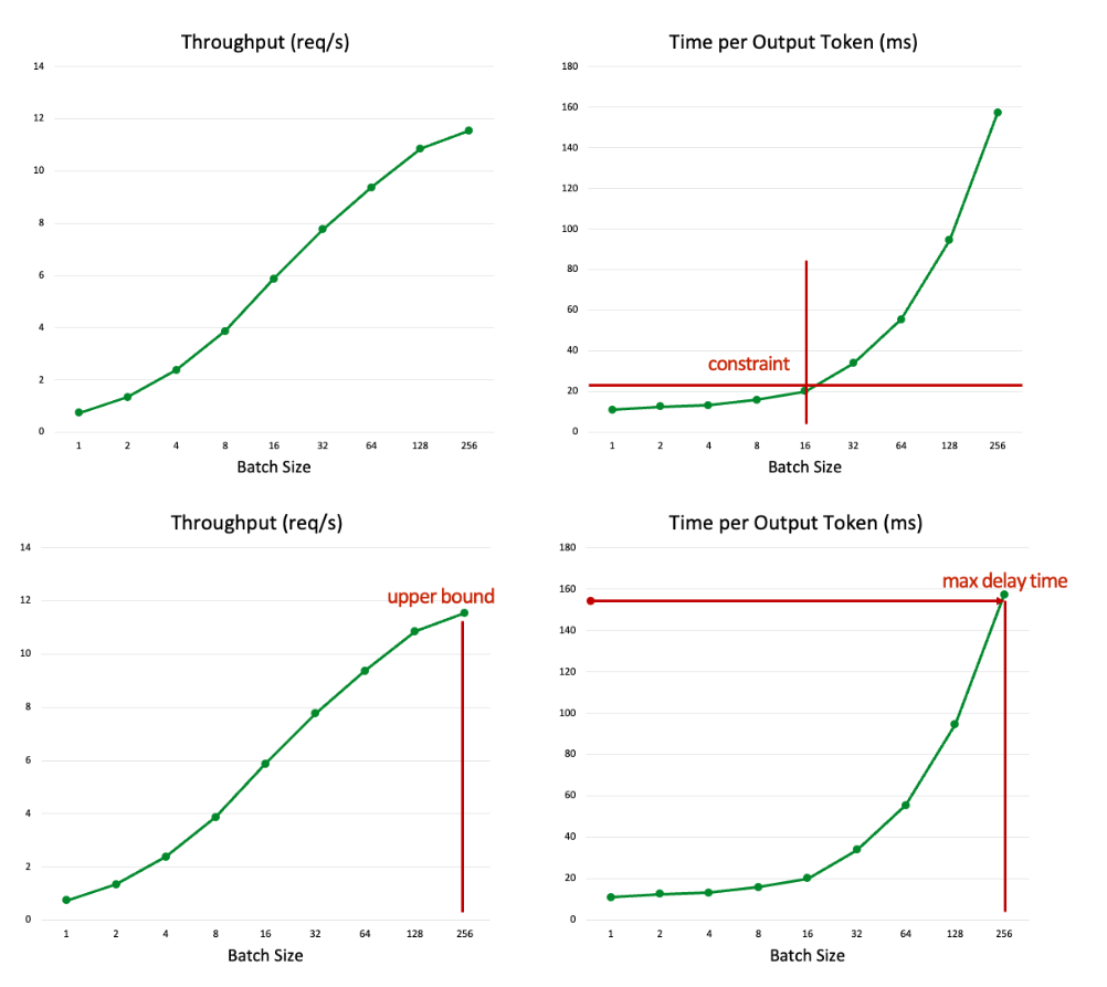 LLM 추론 서버는 처리량을 극대화하기 위해 요청을 일괄 처리합니다. 그러나 이로 인해 지연 시간이 길어집니다. 이러한 상충 관계로 인해 배치 크기가 클수록 처리량은 증가하지만, 응답 시간도 길어질 수 있습니다. 따라서 효율성과 사용자 경험 간의 균형을 신중하게 고려해야 합니다(그림 4). 목표 TTFT(초당 처리량) 및 TPOT(초당 처리량)에 따라 배치 크기를 조정하면 특정 서비스 요구 사항에 더욱 잘 부합하도록 시스템 성능을 최적화할 수 있습니다.