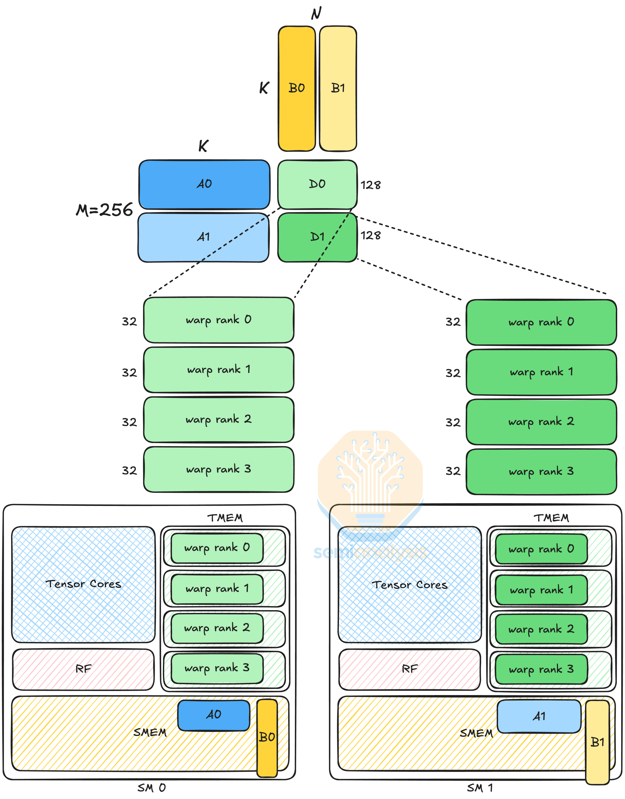 주목할 만한 MMA 변형 중 하나는 MMA.2SM으로, 두 개의 SM을 사용하여 MMA 작업을 공동으로 수행합니다. MMA.2SM은 CTA 쌍 수준에서 실행되며, tcgen05.mma단일 스레드 시맨틱을 가지므로 CTA 쌍의 리더 CTA에 있는 단일 스레드가 MMA.2SM을 실행합니다. 여기서는 데이터 경로 구성 레이아웃 A를 보여줍니다. 레이아웃 A는 MMA.2SM이 1SM 버전( 레이아웃 D ) 에 비해 M 차원을 두 배로 늘렸기 때문에 두 SM이 서로 다른 행렬 A와 D 타일을 로드합니다. 또한, MMA.2SM은 행렬 B를 분할하여 로드되는 데이터 양을 절반으로 줄입니다.
