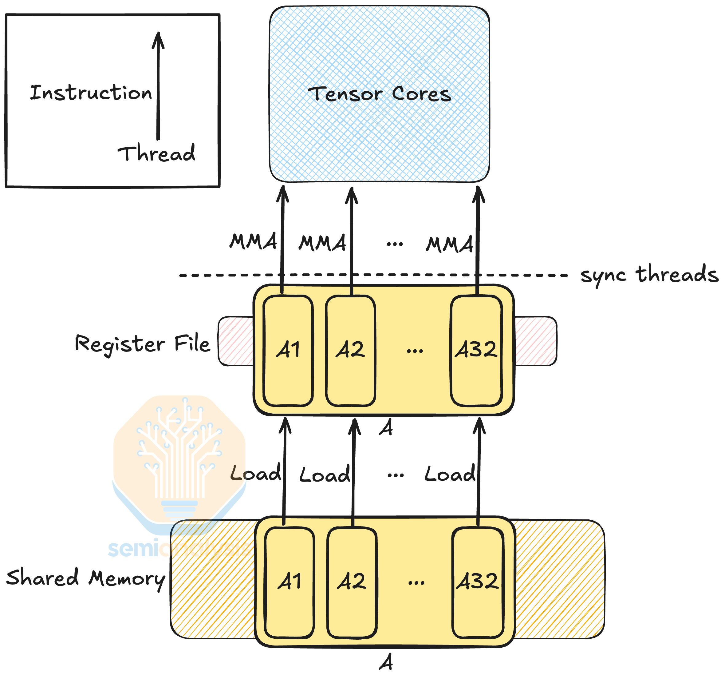 MMA 명령어는 겉보기에 동기에서 비동기로 전환된 것처럼 보였습니다. 실제로 MMA 명령어는 SASS 수준에서 중첩의 필요성 때문에 점차 비동기화되었습니다.LDSM지침.
