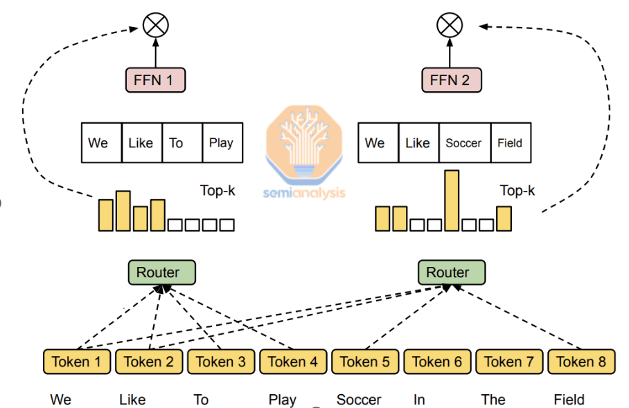 대부분의 최신 LLM은 각 모델 계층 사이에서 토큰이 라우터를 기반으로 여러 전문가에게 라우팅되는 혼합 전문가(Mixture of Experts) 아키텍처를 사용합니다. 최신 MoE 모델에서는 대부분 토큰 선택 라우팅을 사용하여 학습합니다 . 즉, 라우터는 T x E 크기의 텐서를 제공하고(T는 총 토큰 수, E는 MoE 모델의 전문가 수), E 차원에서 topK 소프트맥스를 실행하여 T x K 크기의 텐서를 생성합니다. 이는 라우터가 각 토큰 T에 대해 가장 가능성이 높은 K명의 전문가를 선택하도록 요청받는다는 것을 의미하며, 여기서 K는 한 명 이상의 전문가일 수 있습니다. K는 연구자가 조정할 수 있는 하이퍼파라미터입니다.