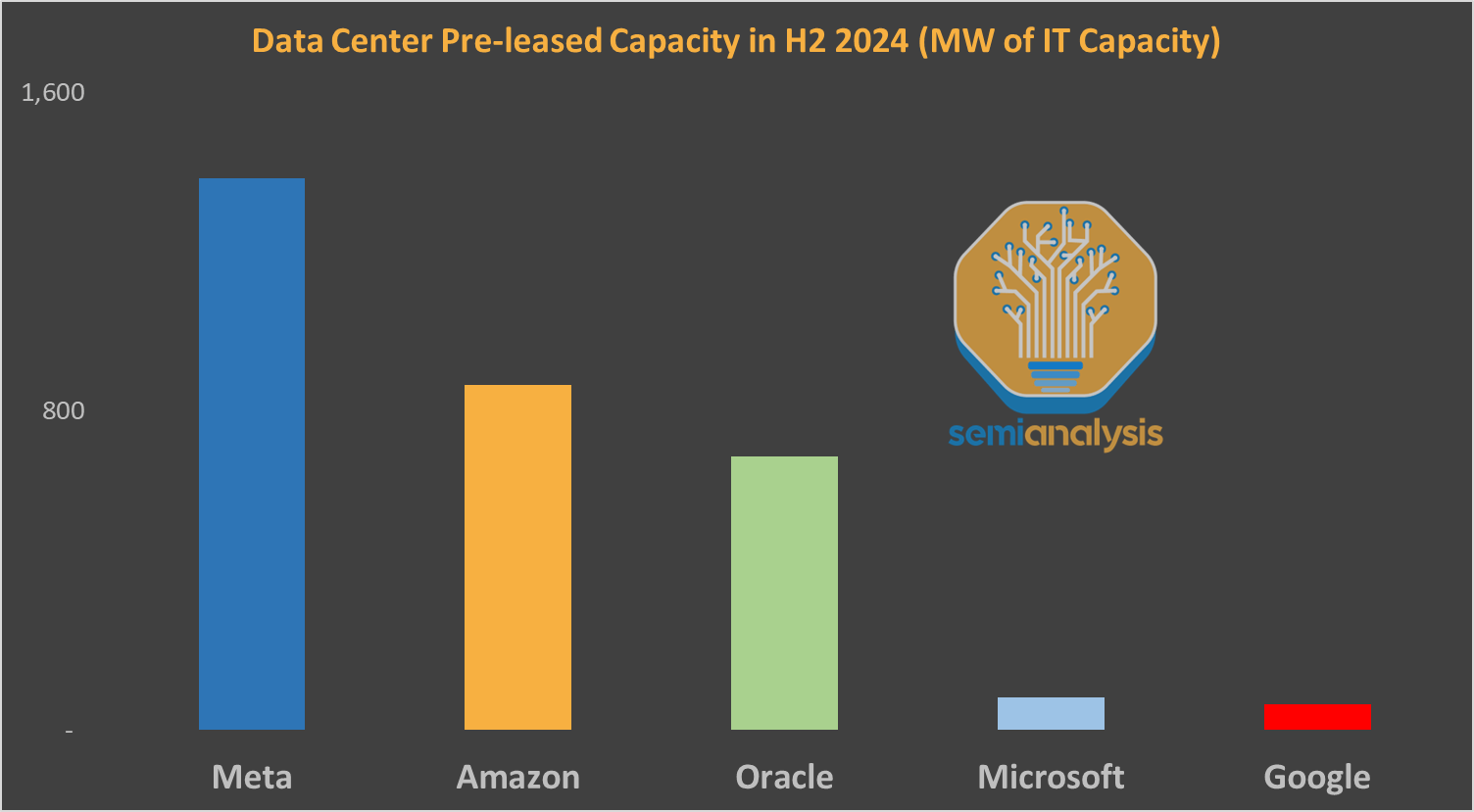 메타는 자체 구축과 임대를 결합함으로써 더욱 빠르게 성장하고 있습니다. 실제로 메타는 2024년 하반기에 오하이오를 중심으로 다른 하이퍼스케일러보다 더 많은 용량을 사전 임대했습니다.