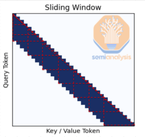 출처: Awnihannun , SemiAnalysis 다른 모델에서 사용되는 슬라이딩 윈도우 어텐션(Sliding Window Attention)은 더 매끄러운 대안을 제공합니다. 어텐션 윈도우가 토큰 단위로 앞으로 슬라이드합니다. 이는 장거리 추론이 맥락을 전파하기 위해 여전히 여러 계층을 필요로 하더라도 지역적 연속성을 유지합니다.