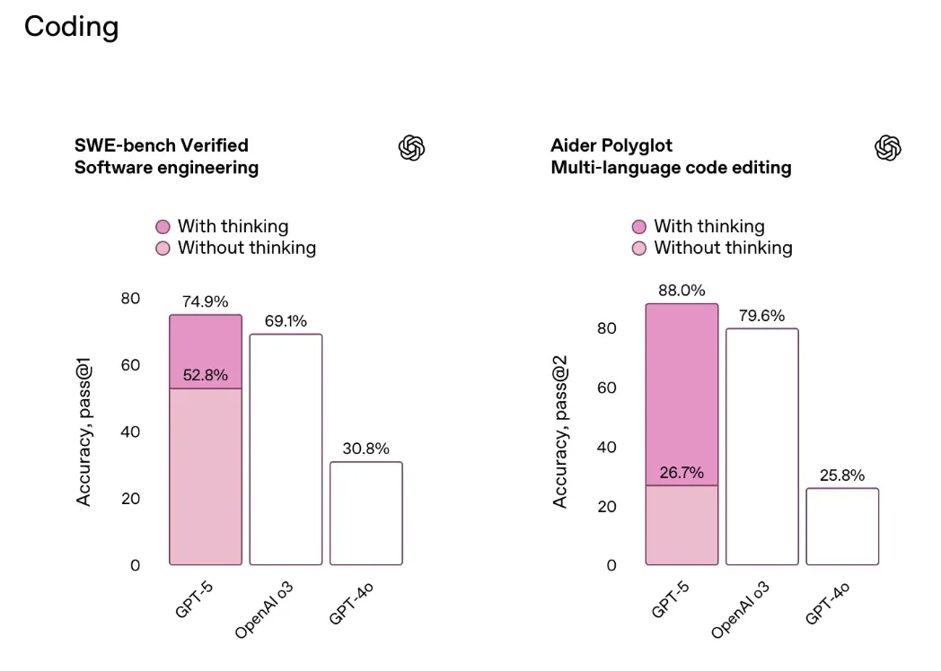 OpenAI는 공식 발표에서 GPT-5가 "수학, 과학, 금융, 법률 등 다양한 분야에서 더욱 스마트해져 더욱 유용한 응답을 제공합니다."라고 강조했습니다. 다시 말해, OpenAI는 추론 기능을 더욱 발전시키고 수많은 벤치마크에서 최고 점수를 달성하는 데 성공했습니다.
