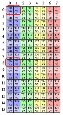 TV (스레드-값) 레이아웃은 (스레드 인덱스, 값 인덱스)를 물리적 주소 인덱스로 매핑합니다. 스레드와 값 레이아웃을 다음과 같이 별도로 읽을 수 있습니다: T = (4, 8) : (32, 1) V = (2, 2) : (16, 8)