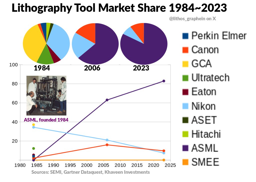 실제로 니콘의 침지형 스캐너는 ASML만큼 성능이 좋습니다. 팹(fab) 업체들은 ASML과 경쟁하기 위해 니콘 스캐너를 여러 대 도입하여 두 업체 모두에게 가격 압박을 가하고 싶어 합니다. 팹이 가장 원하지 않는 것은 공급업체 독점입니다. 하지만 안타깝게도 현실은 그렇지 않습니다. 이것이 니콘이 매년 ASML에 시장 점유율을 빼앗기는 이유입니다. 승자 독식의 구조입니다.