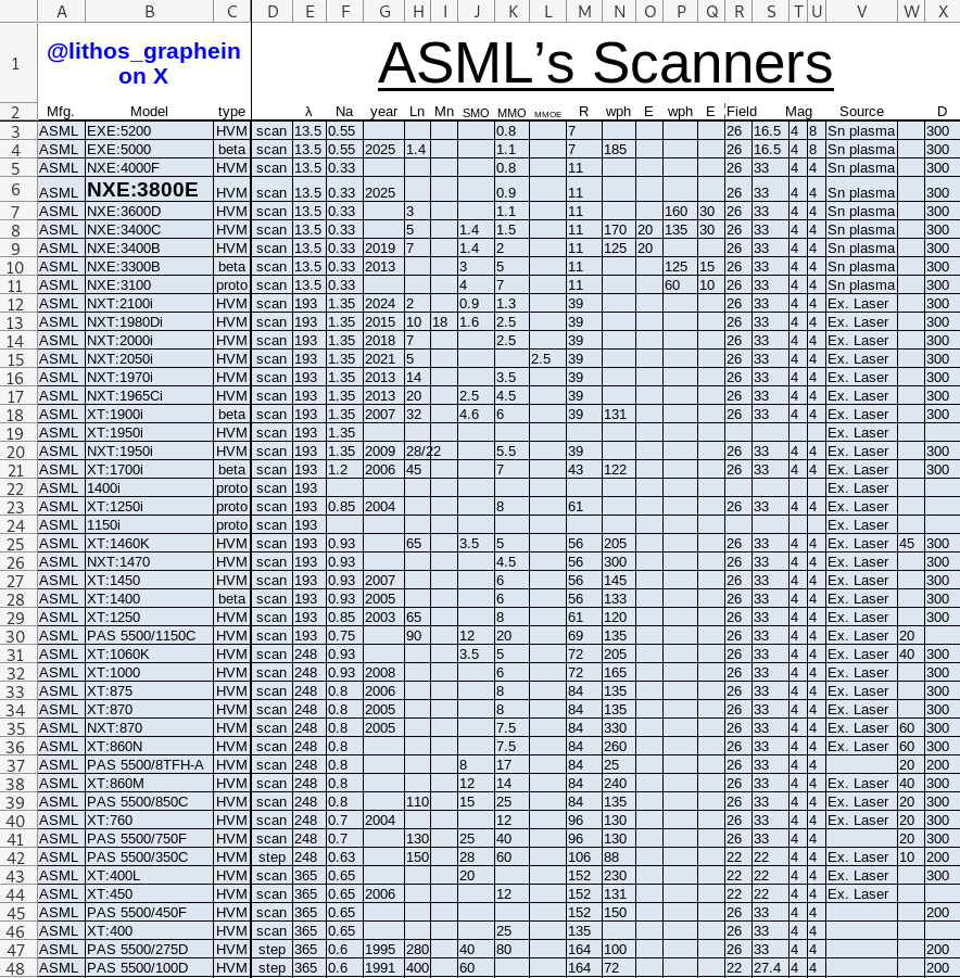 지난 35년 동안 설치된 모든 ASML 스캐너 모델 목록을 소개합니다. 완전한 목록은 아닙니다. 몇 가지 빠진 것도 있을 수 있지만, 제가 직접 사용해 본 도구(대부분 그렇습니다)나 친구들이 사용해 보았다고 알려준 모델을 바탕으로 정리한 것입니다.